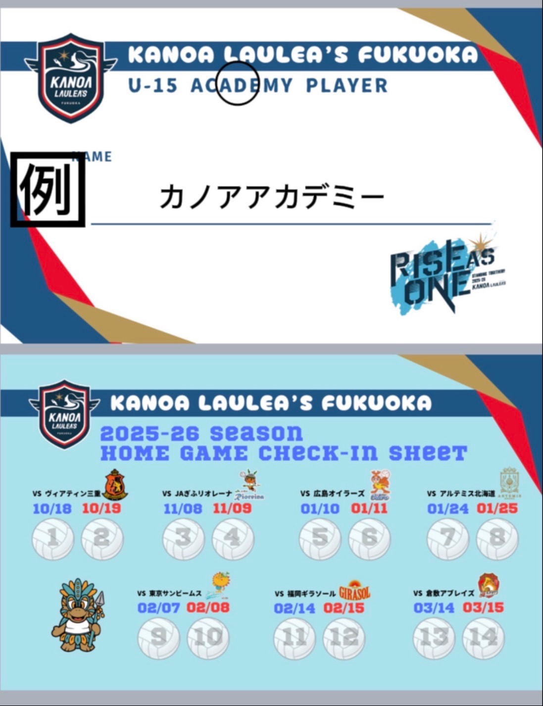 各ホームゲーム会場で入場の際に必ず必要となりますので無くさないよう各ご家庭で管理をお願いいたします。